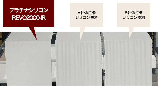 塗膜表面に汚れが付きにくい特殊構造のシリコン樹脂を採用。一般的な低汚染シリコン塗料と比較して雨筋汚れが付きにくく、塗り替え後の美しさを保持することが確認されています